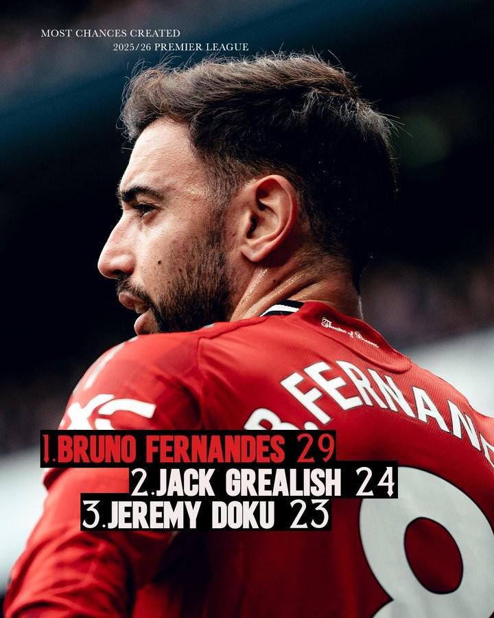 曼联官方晒出数据统计,队长布鲁诺-费尔南德斯本赛季在英超创造29次机会,目前是所有英超球员中最多的,比排名第二的格拉利什(24次)多5次,多库则创造了23次机会,排在第三名。